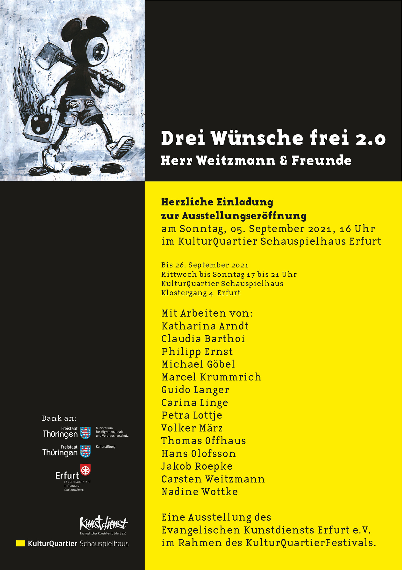 Eröffnung ist am Sonntag, 05. September 2021, 16 Uhr im KulturQuartier Schauspielhaus Erfurt. Geöffnet ist bis zum 26. September, Mittwochs bis Sonntags 17 bis 21 Uhr.