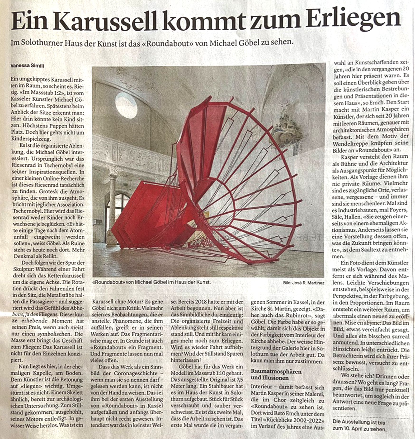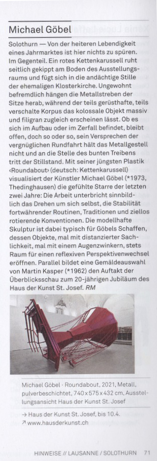 Michael Göbel zeigt die Skulptur Roundabout, eine Plastik in Form eines Karussells. Keines mit Elefant und Reitpferd, Kutsche und Clown. Ein Kettenkarussell mit Sitzbrettern. Ohne Zutaten, ohne Personen. Die Skulptur erinnert gedanklich an Leichtigkeit, an Genuss, an Geschwindigkeit, an Schwerkraft.Doch liegt sie nun am Boden. Massig. Gegroundet. Still. Bewegungslos.