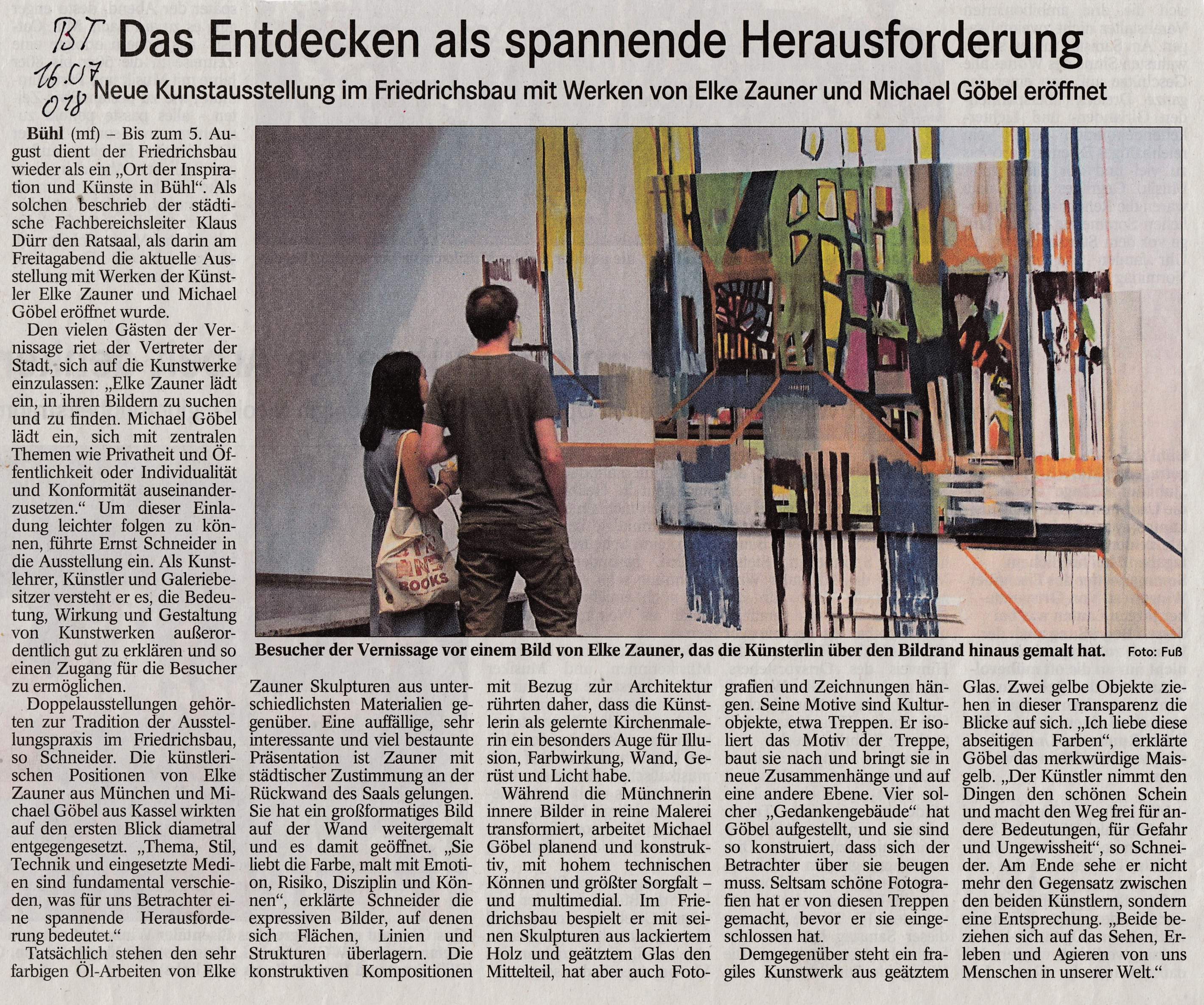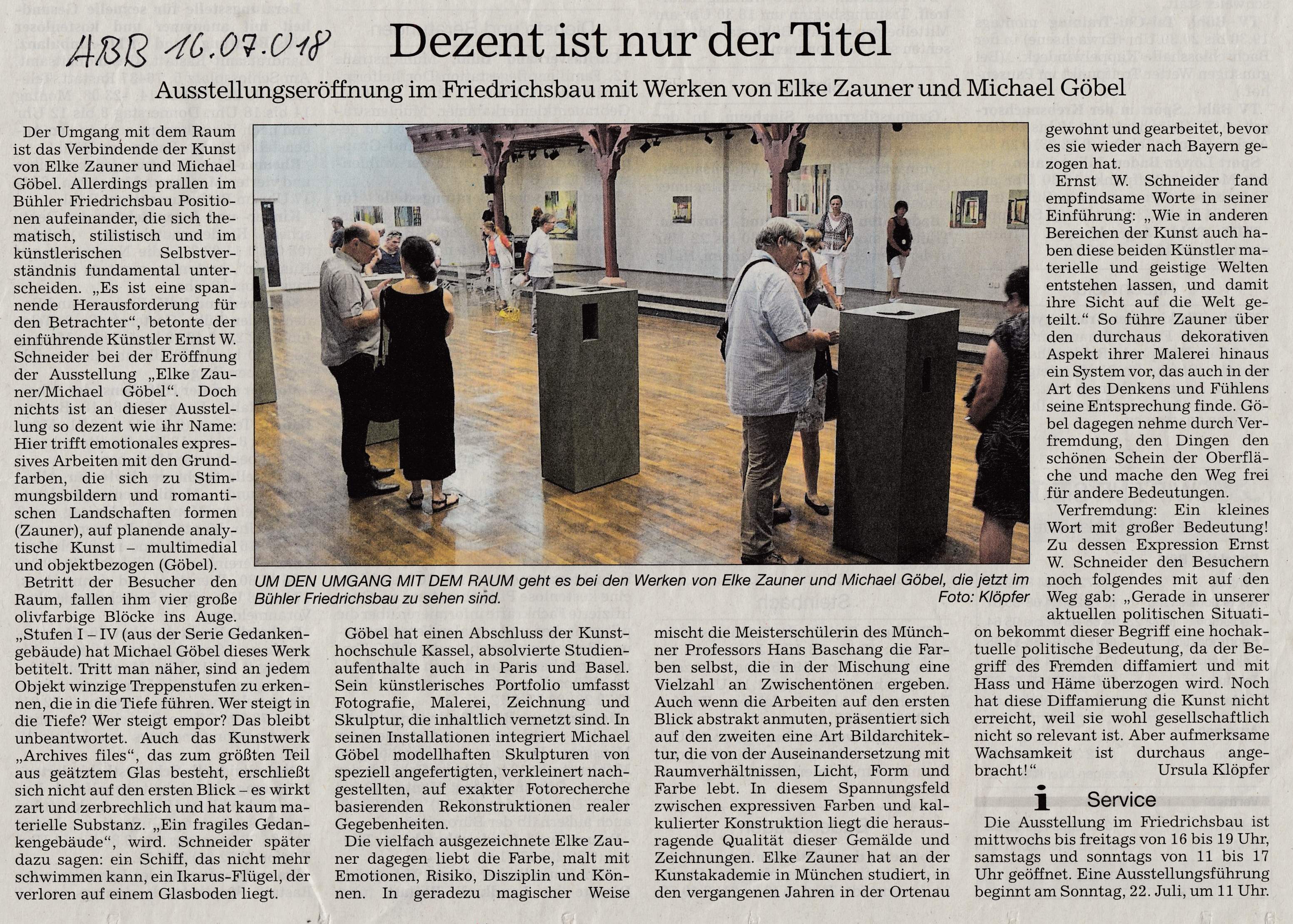 Badischen Zeitung, 24. 2. 2014, Erika Sieberts Expansive Malerei trifft auf dreidimensionale Kulturkritik Malerin Elke Zauner und Objektkünstler Michael Göbel zeigen im Artforum ihre gemeinsamen künstlerischen Ansätze. OFFENBURG. Scheinbar spielerisch haben die beiden Künstler Elke Zauner und Michael Göbel in der Galerie des Artforums die Räume bestückt. Leicht und frei kommen die Kunstwerke auf Wand und Sockel daher, als ob man daran weitermalen und weiterbauen könnte. Dabei ist alles streng geplant. Kein Bild von Zauner entsteht aus dem gestischen Strich und kein Objekt stellt Göbel mit schneller Hand zusammen. Die Malerin aus München und der Objektkünstler aus Kassel haben sich bei Symposien kennengelernt und bemerkt, dass sie künstlerisch ähnliche Ansätze haben. Dies ist ihre erste gemeinsame Ausstellung: er, 1973 in Niedersachsen geboren, Studium an der Kunsthochschule in Kassel – sie, 1972 in Bayern geboren, Studium an der Akademie für bildende Künste in München. Da sind die bemalten Wände und Leinwände von Elke Zauner, die quasi über sich hinausmalt. Expansiv sind die Konstruktionen, die sie zunächst auf einer Leinwand anlegt, deren Linien und Farbflächen jedoch den dafür vorgesehenen Rahmen verlassen und sich wie Baugerüste und Kräne über die gesamte Wand verteilen und ihre eigene Architektur schaffen. Perspektivische Fluchten bringen Dynamik, Farbe verleiht den Linien Hierarchie und den Flächen harmonische Muster. Der Betrachter beobachtet von seinem Standort aus den Bau einer Großstadt im Zeitraffer. Stillstand, Eingefrorensein als Gefühlsausdruck, vermitteln die Arbeiten von Michael Göbel. Zwei Modelle bereits ausgeführter Arbeiten liegen wie Opfer einer beendeten Freizeitkultur auf einem Sockel: das Fragment eines Riesenrads und das eines Kettenkarussells. Inhaltlich eine ebenso zufällige wie treffliche Ergänzung zum großen Wandbild von Elke Zauner, das sie Phantasialand genannt hat. Die Eindrücke habe sie beim Arbeiten im Freizeitpark bei Köln gesammelt. Auch das Riesenrad von Michael Göbel hat eine reale Geschichte. Der Künstler bezieht sich auf einen Mitte der 1980er Jahre in Plan befindlichen Rummelplatz in Prypjat, der den Angestellten des Atommeilers in Tschernobyl Abwechslung verschaffen sollte. Das Projekt ist gestoppt worden. Göbel schafft dreidimensionale Objekte und gibt ihnen einen einheitlichen Anstrich. Gleichmachen will er individuelle Erscheinungen, kaum mehr unterscheidbar voneinander – ob es Baukastenelemente sind, die er in seiner eierschalenfarbenen Pförtnerloge zeigt, oder Riesenrad und Karussell. Unter ihrer monochromen Hülle verlieren die Gegenstände ihre Einzigartigkeit. Göbel setzt sich kulturkritisch mit dem Individualismus auseinander. Auf der oberen Etage zeigt er seine Schmetterlingssammlung, die er selbst gebaut und einheitlich geschwärzt hat, ebenso Armbanduhren in offenen Schatullen. So entzieht er den Dingen ihre Daseinsberechtigung als bunte Schönheit oder modernes Designobjekt. Auch zeichnerisch untersucht Göbel die Grenzen des Monochromen. Mit hellen Grautönen auf weißem Papier entwirft der Künstler Stillleben, die ganz subtil ihre Komplexität entfalten.